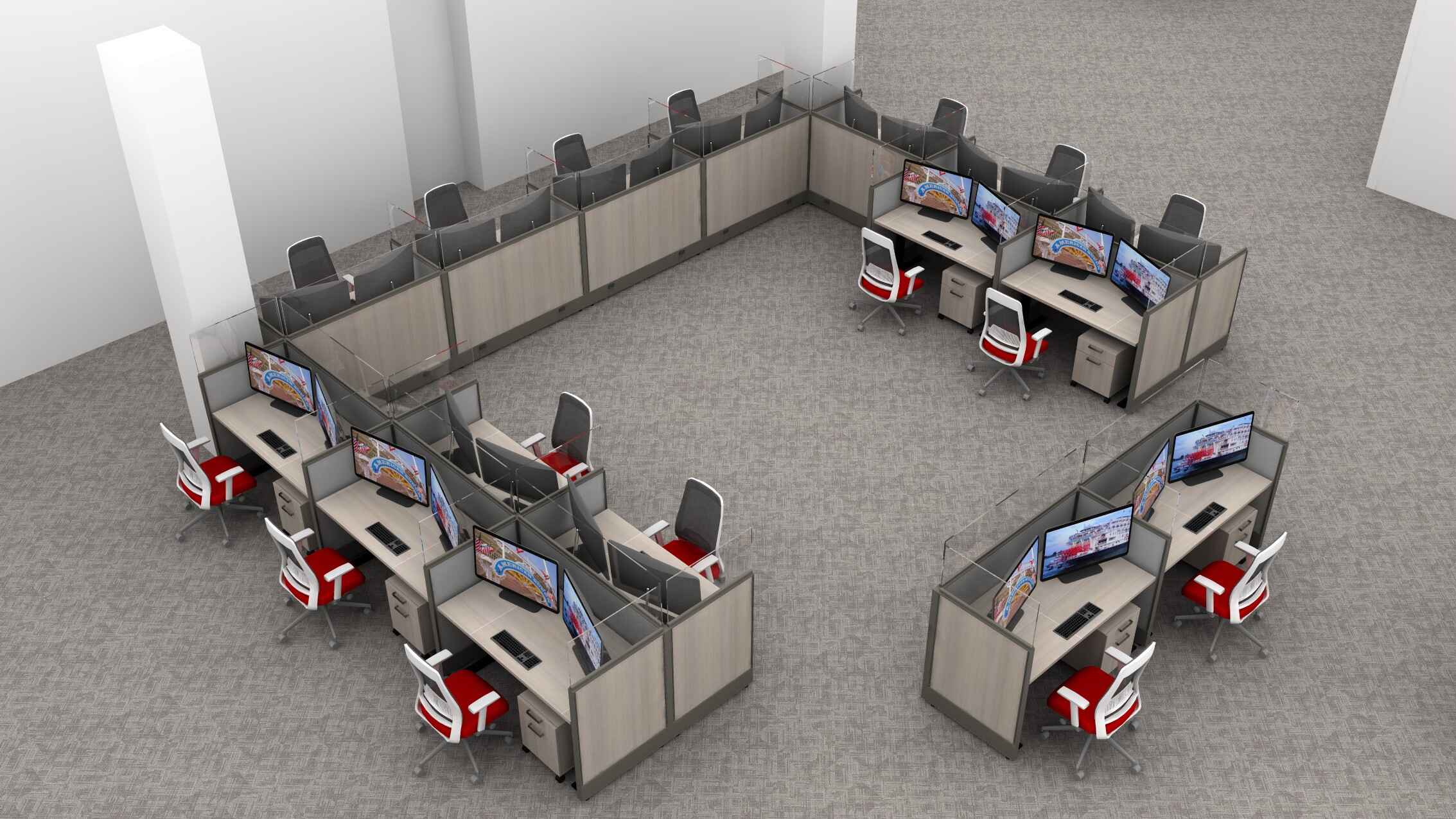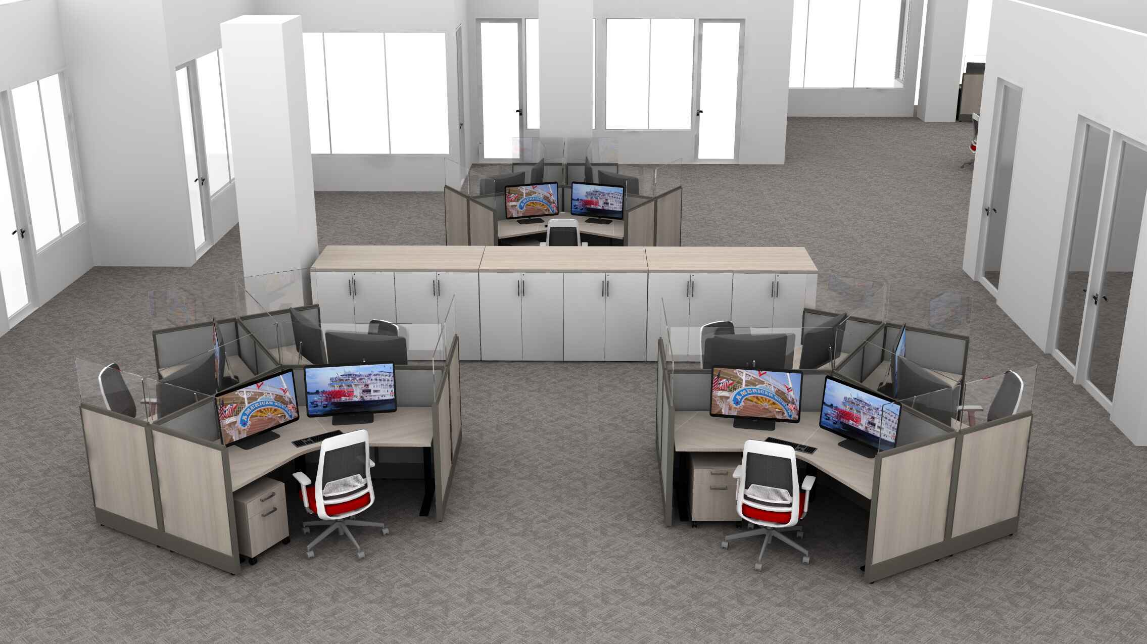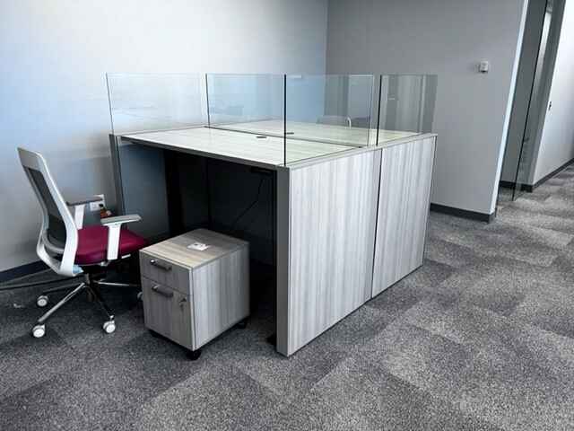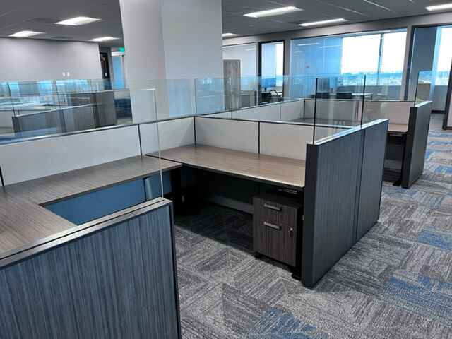 – Low Panel Height with Clear Recessed Glass, Wood Laminate and Fabric Tiles, Adjustable Height Desks, Color Pops of Red to Match Company Logo